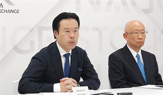 3~8月期の決算を発表する岡谷社長(左)