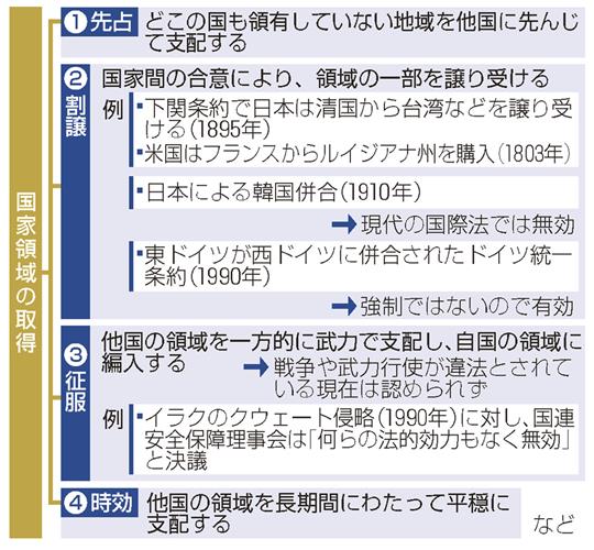 国家領域を取得する方法には①どこの国も領有していない地域を他国に先んじて支配する「先占」②国家間の...