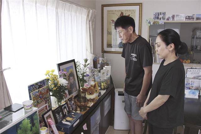 久保田大治郎さんの遺影を見つめる母真実さん(右)と父純司さん=8月、東京都八王子市