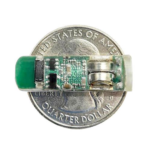 米カリフォルニア工科大チームが開発したカプセル型の腸内環境計測装置。後ろはサイズ比較用の25セント硬貨(研究チーム提供)
