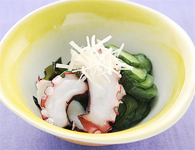2人分でキュウリ1本、ゆでだこ40グラム、塩蔵ワカメ10グラム、A(酢大さじ2、砂糖小さじ2、塩少...