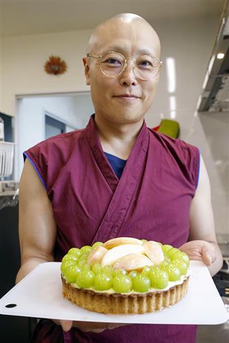 手作りのタルトを持つ住職の阿部真典さん=北海道当麻町