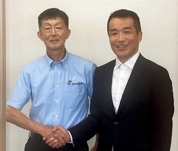 握手する紅久の三浦社長(左)とマテリサグループの谷口社長