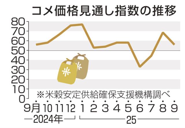 向こう3カ月のコメ価格の見通しについて、米穀安定供給確保支援機構は6日、9月の指数は57と発表した...