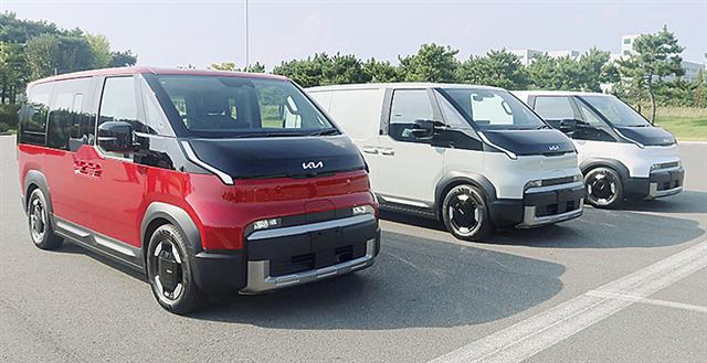 試乗会に用意されたキアのEVバン「PV5」=1日、ソウル近郊(共同)