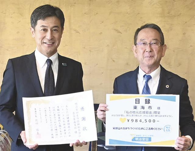 【半田】明治安田生命保険名古屋南支社(小島啓支社長)は2日、東海市が進める「いきいき元気推進事業」...