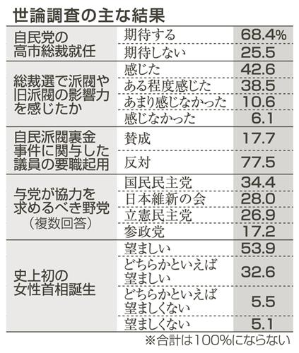 自民党の高市早苗総裁選出を受け、共同通信社は4~6日、全国緊急電話世論調査を実施した。高市氏に「期...