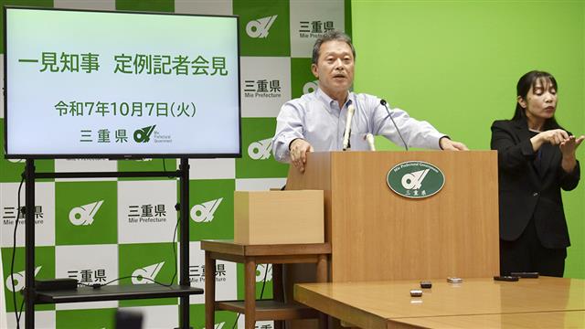 定例記者会見で、罰則付きのカスハラ防止条例について説明する三重県の一見勝之知事=7日午後、三重県庁