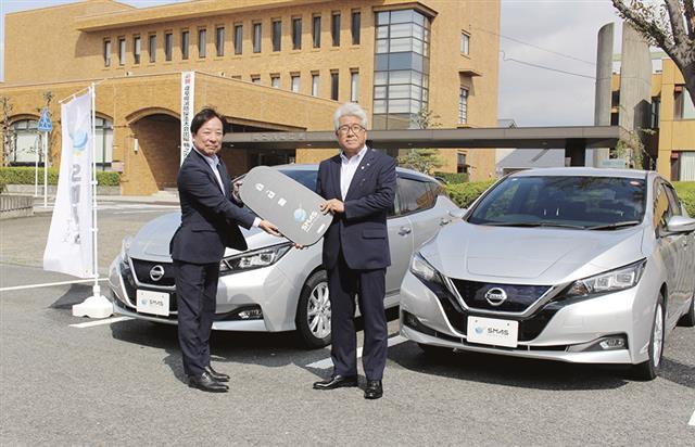 EVの前で記念撮影するSMAS名古屋支店営業第二部の背山智部長(左)と朝倉和仁町長