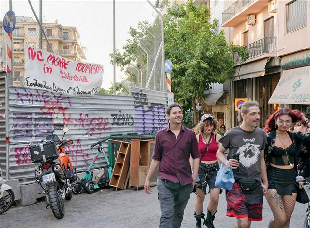 地下鉄駅の新設工事が進むアテネ中心部エクサルヒアの旧広場。グラフィティだらけの仮設フェンスに「もう観光をさせるな」と書かれた横断幕が掲げられていた(撮影・沢田博之、共同)