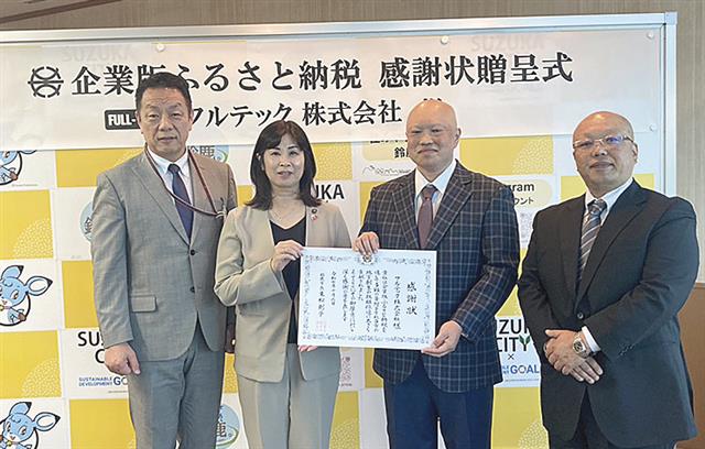 鈴鹿市で行われた感謝状の贈呈式(右から2人目が古田社長)