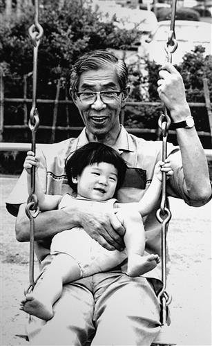 母方の祖父三浦正勝に抱かれる0歳頃の上田渉。祖父の視力は徐々に悪くなっていた