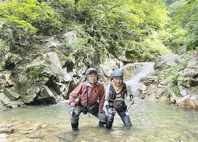一緒にイワナ釣りをするために岩手県の和賀川を訪れた伊東信一郎さん(左)と黒笹慈幾さん=2022年7月