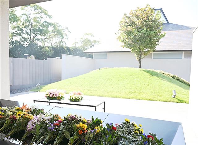 横浜市営墓地の合葬式納骨施設。ハナミズキの下に遺骨が納められており、献花台からお参りする=横浜市港南区