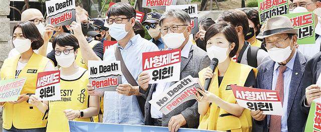 2022年7月、ソウルの韓国憲法裁判所前で死刑制度は違憲だと訴える市民ら(聯合=共同)