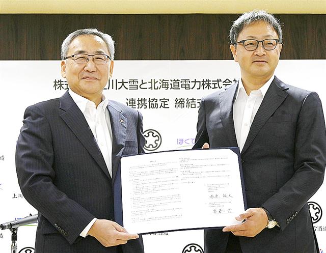 連携協定を結んだ「上川大雪」の塚原敏夫社長(右)と北海道電力の斎藤晋社長=9月、札幌市中央区
