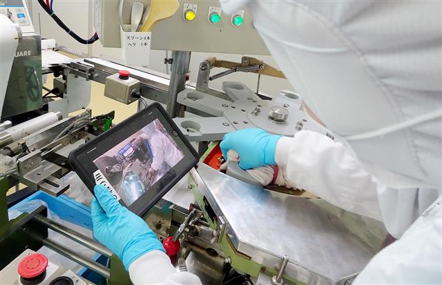タブレットで動画を確認しながら作業する栄光堂ファクトリーの従業員(大垣工場で)