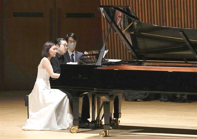 2021年に長野県軽井沢町で開かれたコンサートで共演する、ショパン国際ピアノ・コンクール入賞者の反田恭平さんと小林愛実さん(手前)
