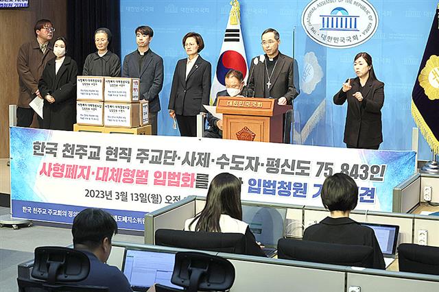 2023年3月、死刑廃止を求める記者会見を開くキリスト教の関係者ら=ソウル(聯合=共同)