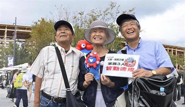 全184日来場の「皆勤賞」を達成した「万博おばあちゃん」として知られる山田外美代さん(中央)=13日午前、大阪市此花区の夢洲