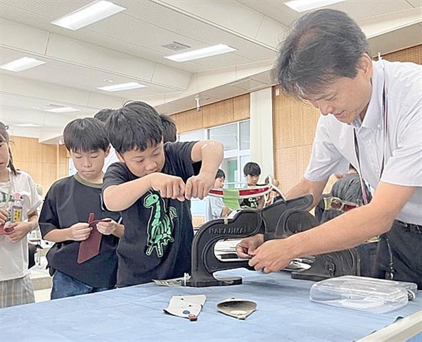 革端材でコインケースをつくる児童