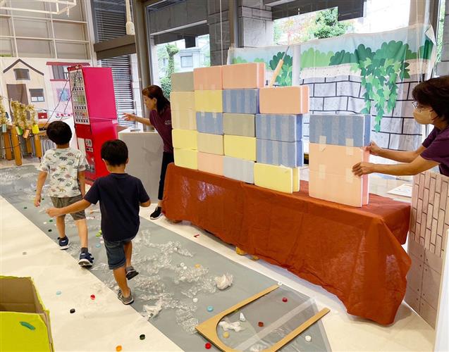 体験型安全教育で、地震後に道に落ちている物を踏まないで歩く練習をする子どもたち(体験型安全教育支援機構提供)