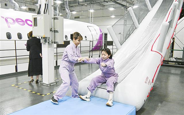 ピーチの複合研修施設で、緊急脱出スライドを使って訓練する社員=7月、関西空港