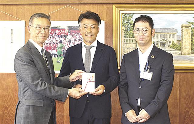 贈呈式に出席した有賀校長、松本社長、佐藤支店長(左から)