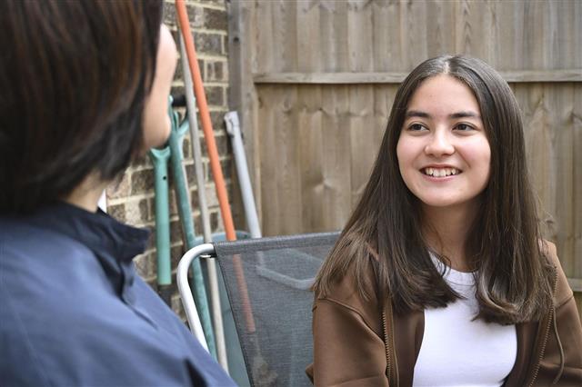 選挙権年齢の引き下げについて母親と話すキミコ・フラナガンさん(右)8月、ロンドン(共同)