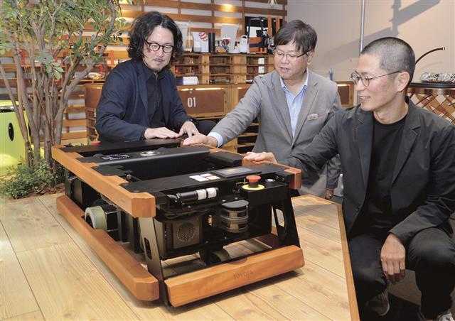 両社の開発メンバーと自動搬送機(AGV)のコンセプトモデル「木カート」