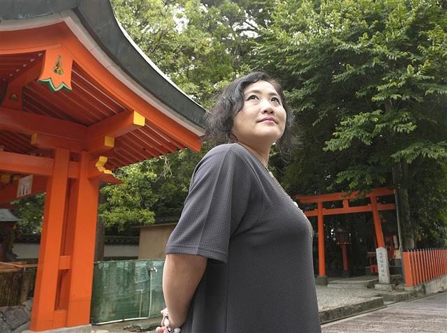 熊野速玉大社を訪れた中上紀。父、中上健次の四十九日の法要があった日、周囲の木々から父の声が聞こえた気がした=和歌山県新宮市(撮影・林昌三)