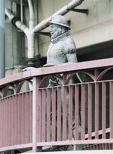 橋の上に立ち、川をながめる南蛮人像=堺市堺区の南蛮橋