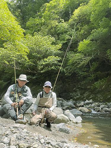 高知県の奈半利川にアマゴ釣りに訪れた、山井太さん(左)と黒笹慈幾さん=2023年5月
