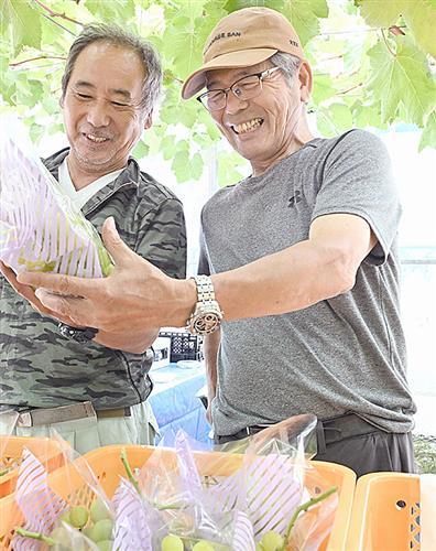 避難先で新たに栽培したブドウの収穫に成功した渡辺信行さん(右)=9月、福島県いわき市