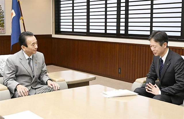 リニア中央新幹線の工事に関し協議する、静岡県の鈴木康友知事(左)とJR東海の丹羽俊介社長=20日午前、静岡県庁