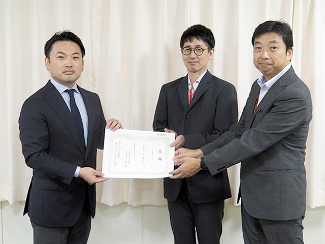 贈呈式の様子(左から鈴木社長、福田校長、勝谷校長)