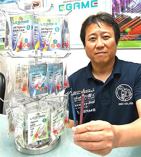 模型用工具を手にする大河内社長。店頭販売を想定し、製品パッケージと販売用スタンドも工夫した