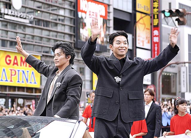 名古屋まつりの行列に参加し、沿道の人たちに手を振るNHK大河ドラマ「豊臣兄弟!」主演の仲野太賀さん(右)と小栗旬さん=19日午後、名古屋市