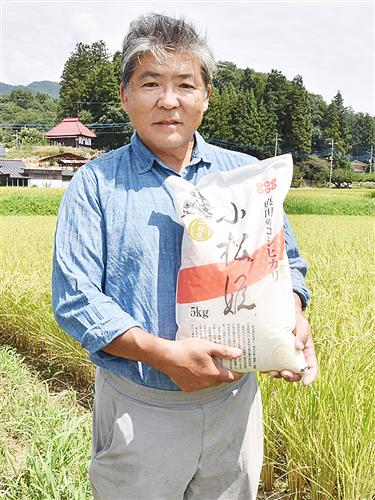 ブランド米「真田のコシヒカリ 小松姫」を持つ金井繁行さん=8月、群馬県沼田市
