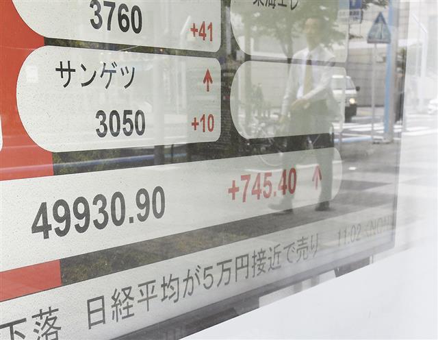 上げ幅が一時700円を超え、4万9900円台に達した日経平均株価を示すモニター(名古屋証券取引所)