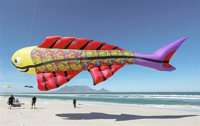 南アフリカ・ケープタウンのビーチに浮かぶ、魚の形をしたたこ。迫力満点です。(ロイター=共同)...