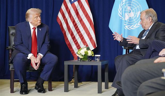 米ニューヨークの国連本部で会談するトランプ大統領(左)とグテレス事務総長=9月23日(共同)