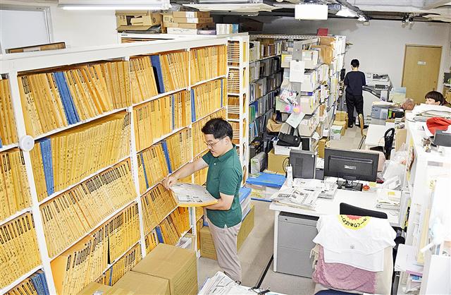 認定NPO法人「原子力資料情報室」の室内。棚にはファイルや書籍が並ぶ=9月、東京都中野区