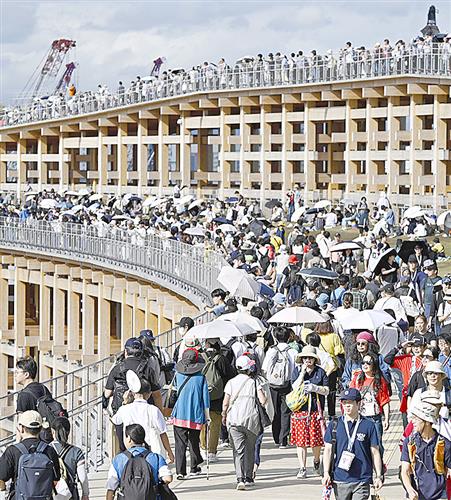 閉幕日、大勢の来場者でにぎわう大阪・関西万博の大屋根リング=13日、大阪市此花区の夢洲
