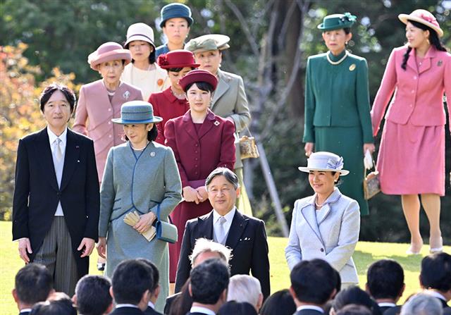 秋の園遊会に臨まれる天皇、皇后両陛下と皇族方=28日午後、東京・元赤坂の赤坂御苑(代表撮影)