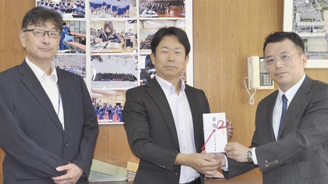 贈呈式に出席した福本支店長、丹下校長、新美社長(左から)