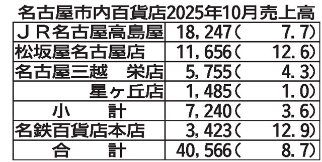 (注)単位は百万円。かっこ内は前年同月比増減率、単位は%。JR名古屋高島屋にタカシマヤゲートタワーモール、ウオッチメゾン、フードメゾン岡崎店を含む。名古屋三越の栄店はラシック、三越豊田、エムアイプラザ常滑含む