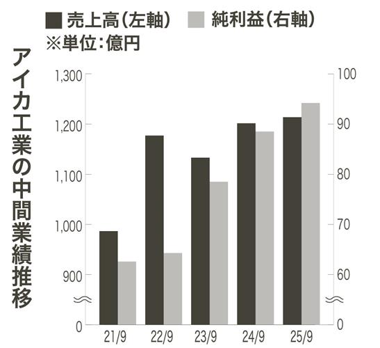 建材メーカーのアイカ工業(本社名古屋市)が5日発表した2026年3月期中間決算(4~9月期)は、純利益が前年同期比6・4%増の94億2400万円となった。建装建材事業は国内で高付加価値商品の採用が拡大。売上高、各利益とも過去最高を更新した。通期も販売の好調が継続するとみて、増収増益の見通し。