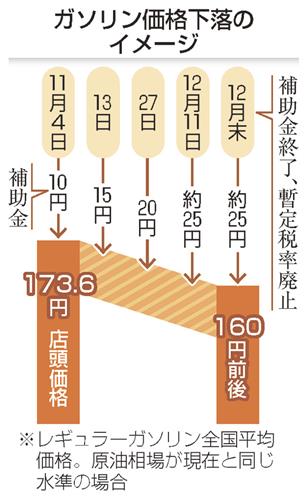 ガソリンの暫定税率廃止に向けた補助金の段階的増額により、店頭価格は11月中旬にも下がり始める見通し...