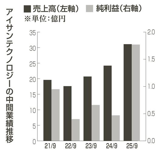 測量・土木関連のソフトウエアや自動運転の導入支援を手掛けるアイサンテクノロジー(本社名古屋市)が12日発表した2026年3月期中間決算(4~9月期)は、純利益が前年同期比約3・8倍の1億7700万円だった。測量機器販売で大型案件が寄与したほか、自社開発のアプリの販売が伸長。売上高、各利益とも過去最高を更新した。通期も増収増益を予想している。